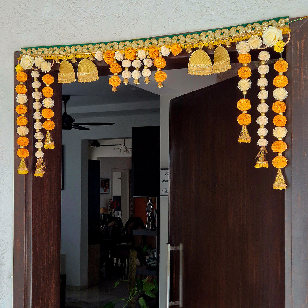 - Featuring dried flowers, yellow shola roses, and golden rings, these door hanging toran decorations create a perfect look for any festival or special occasion.