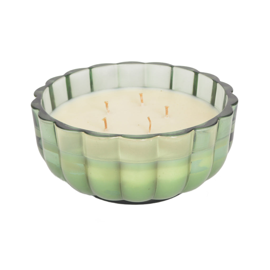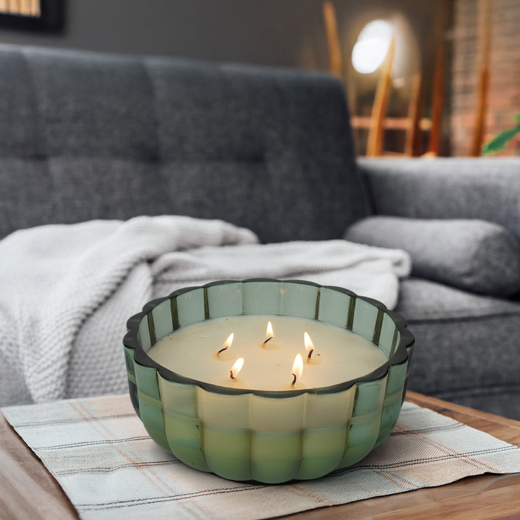 Encased in a statement scalloped glass jar, this candle doubles as a décor accent even when unlit. Its generous presence makes it ideal for dining spaces, living rooms, or festive centerpieces.