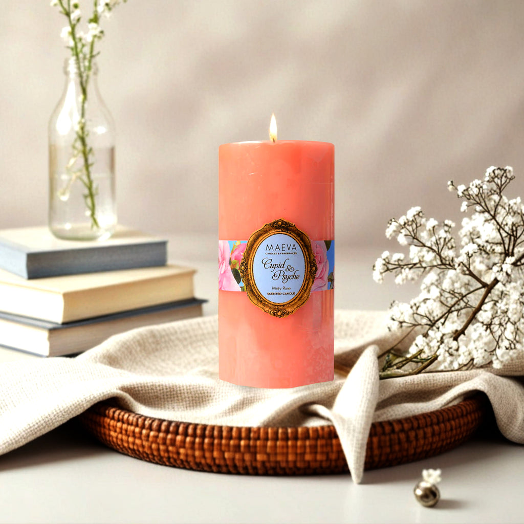 A love letter to the passionate rose, this pink-bloom pillar candle is a hit of ultra-feminine, misty rose flower fragrance that lingers long after the flame has died. Hand-crafted into an elongated pillar, our romantic bedroom candles steer you to bask in the glow of romance. Use one or club several sizes of the same together to create a dramatic effect or heighten the ambiance of romance!
