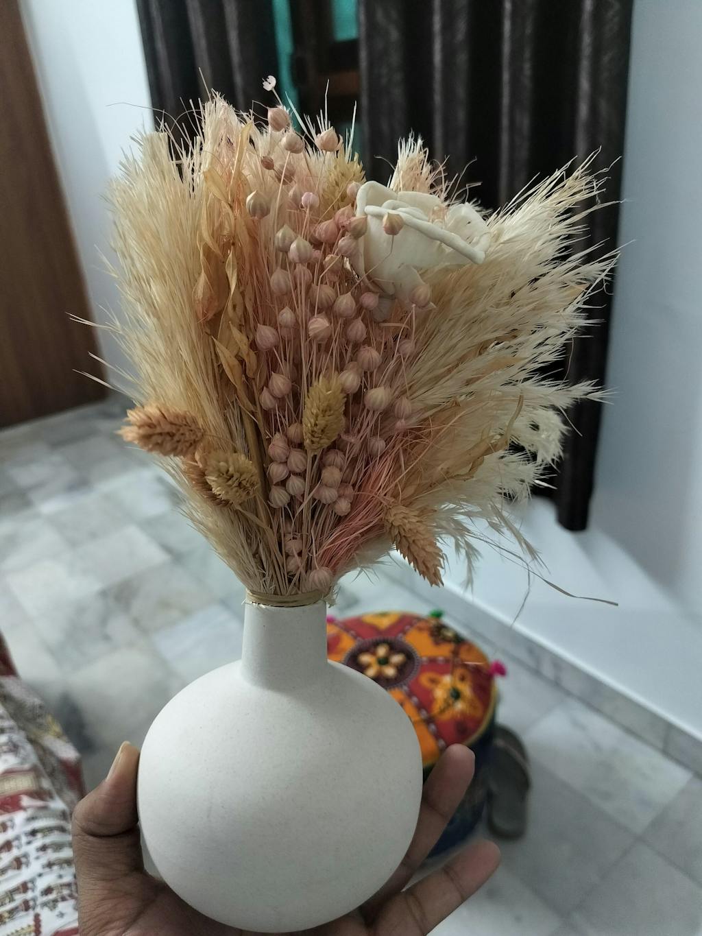 - The combination of shola roses, lilac bunny tails, and ruscus grass in this bunch, along with a glass vase, quickly adds a dash of colour, and lifts your home decor game.