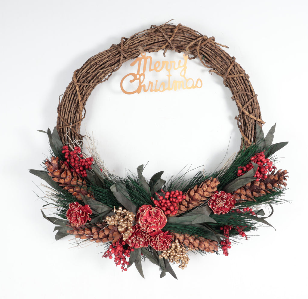 Welcome the season with timeless elegance using our Pine Cone Lit Christmas Wreath—perfect for your front door or as a festive centerpiece, adorned with dried shola flowers, green leaves, and red berries for a charming, enduring touch.