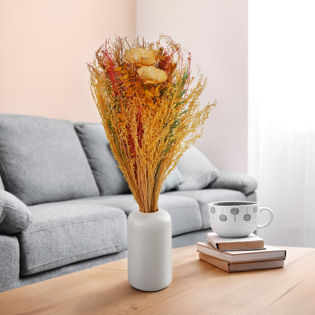 Inspired by warm hues and cheerful tones, the Summer Citrus Bunch adds energy and vibrance to your space. Its textured dried florals create visual interest while maintaining a clean, modern aesthetic.